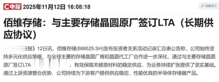 5)佰维存储:与主要存储晶圆原厂签订LTA(长期供应协议)。