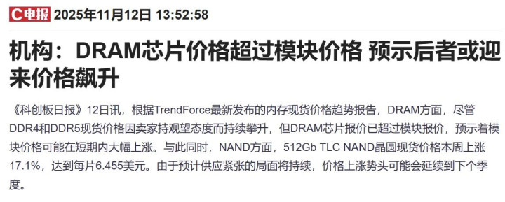 2)机构:DRAM芯片价格超过模块价格,预示后者或迎来价格飙升