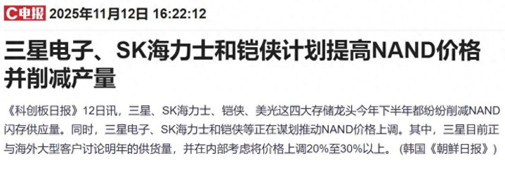 1)11月12日消息,三星电子、SK海力士和铠侠计划提高NAND价格,并削减产量。